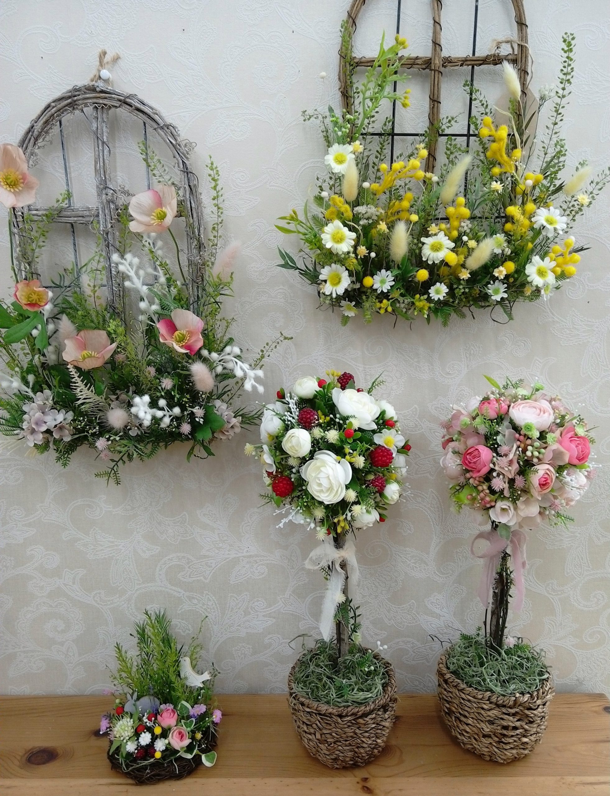 【材料キット】3種紹介 商品・サービス Twitter Facebook はてブ Pocket LINE 2022.03.14 ウィンドウアレンジ(左)ポピーとWミモザ(右)デージーとミモザどちらも2900円 写真左側スプリングガーデンスタイルのトピアリーホワイト(いちご)ピンクどちらも3000円 写真右側ミニガーデンアレンジ 900円 ※各種税込、1セットの値段になります 今回のセットは材料のみの販売です。作り方説明書は付属しません。店頭にて完成品サンプルがご覧いただけます。