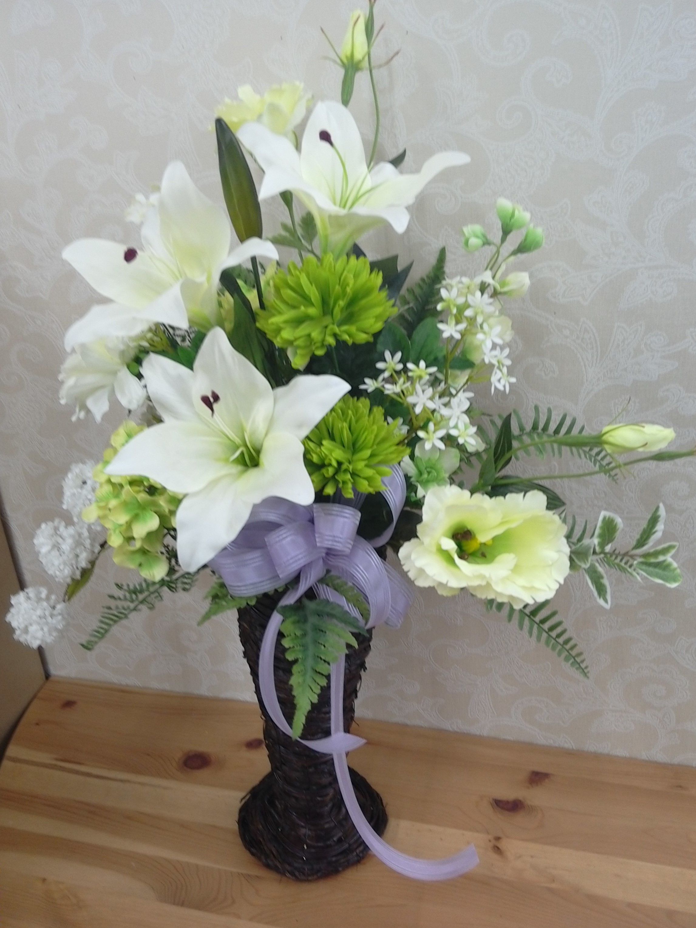 お供えアレンジはお申し込みの際にご希望のご予算、色合いをお伝えください。写真の参考作品は6500円(税別)になります。