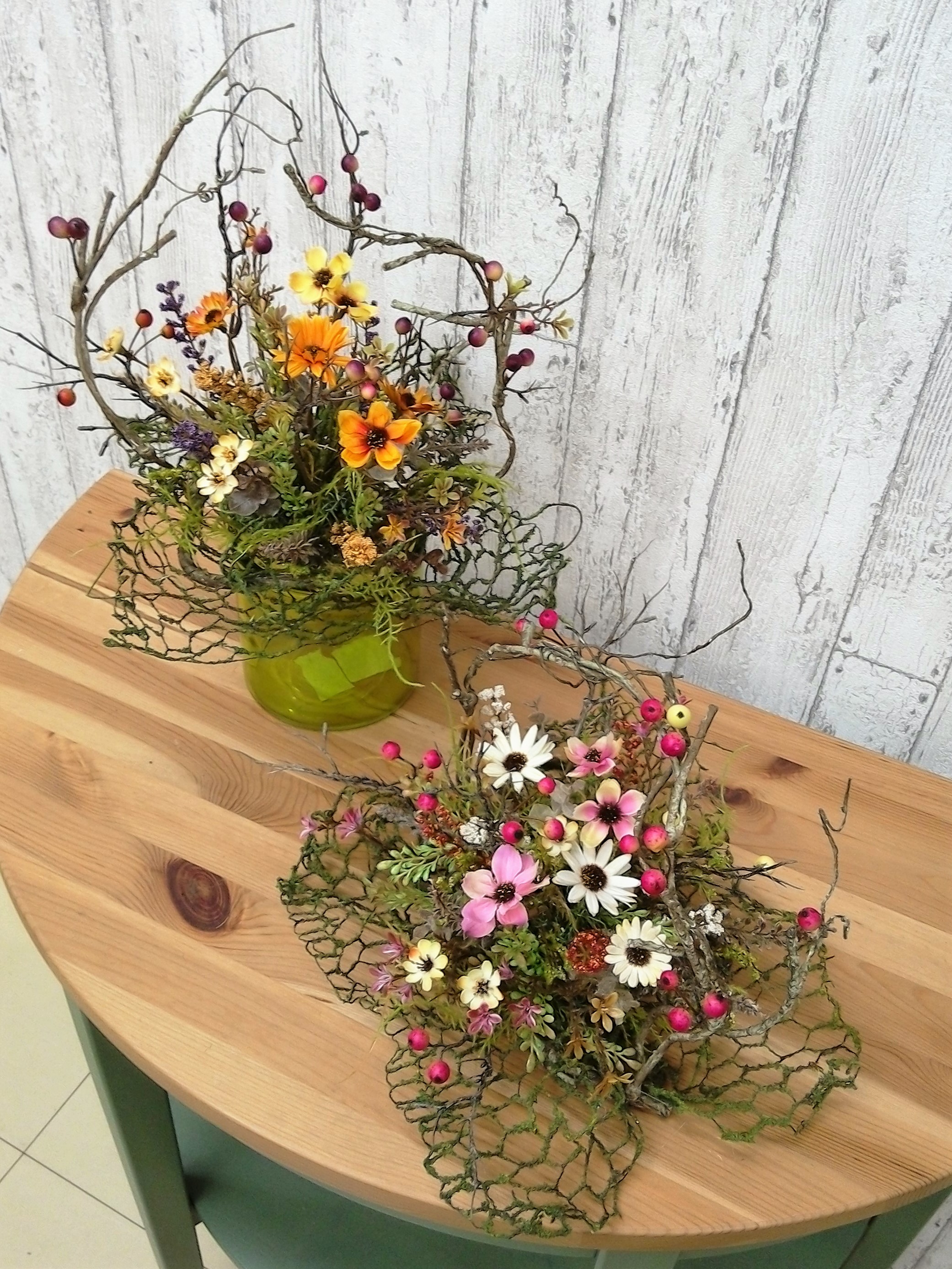 モスネットとアーティフィシャルバインでバスケットを作り、花をアレンジします。