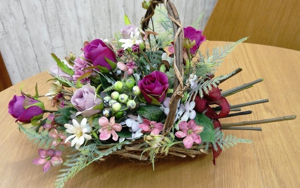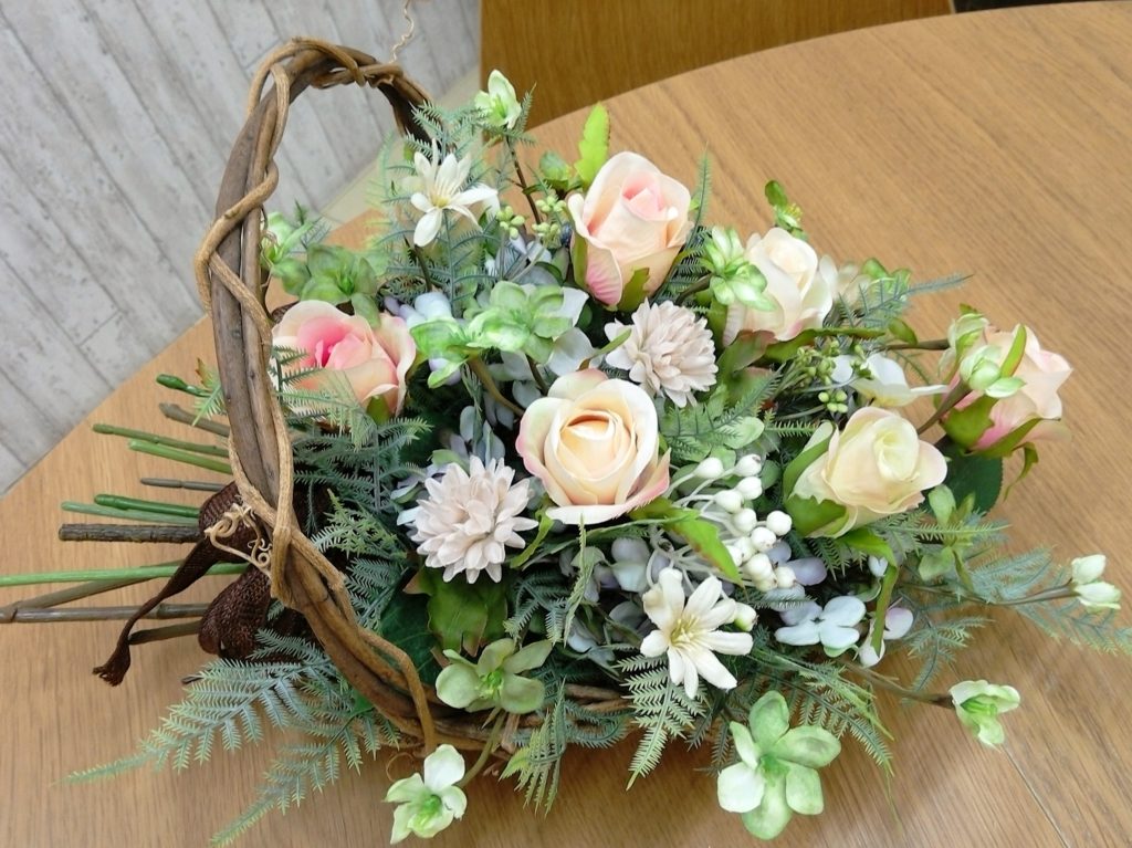花束がバスケットの上に置かれているように見えるアレンジです。